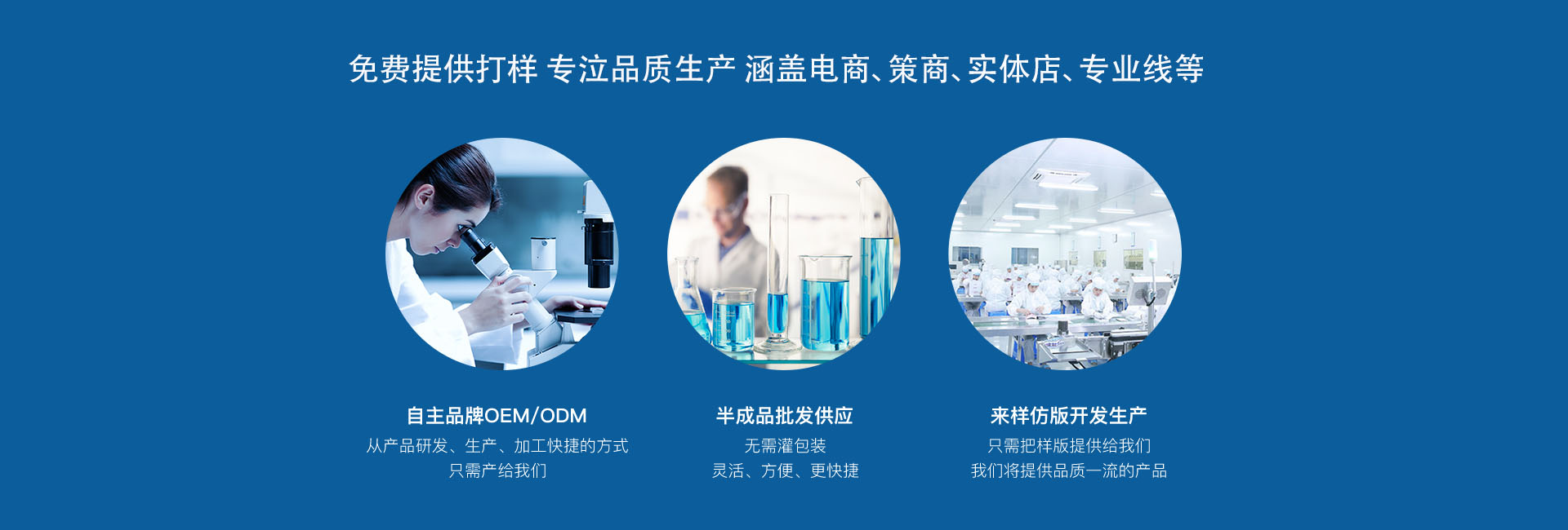 眾德生物科技以化妝品、面部功效型問題型肌膚用品科研,生產(chǎn)銷售、品牌策劃、OEM/ODM專業(yè)貼牌/代加工,微商/網(wǎng)商/視商凈膚美膚護膚品、面膜系列產(chǎn)品加工,一抹瘦減肥產(chǎn)品代加工,養(yǎng)生保健品代加工等。